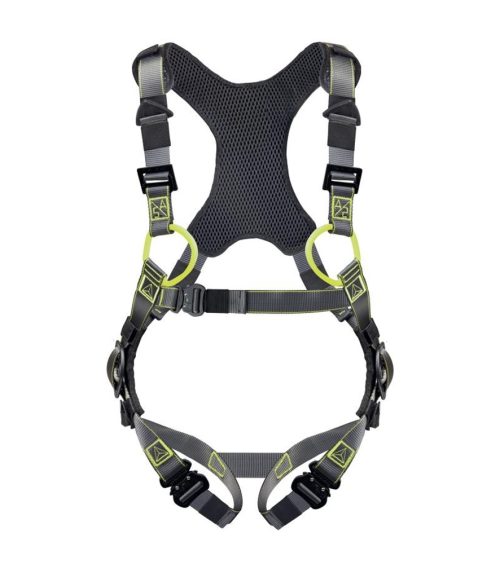 Kétszínű testheveder. 2 zuhanásgátló bekötési ponttal (hátul - elöl). 5 állítható csat, amelyből 3 automatikus és 2 nem eltávolítható. Hálós megerősítés a vállakon és a medencénél.