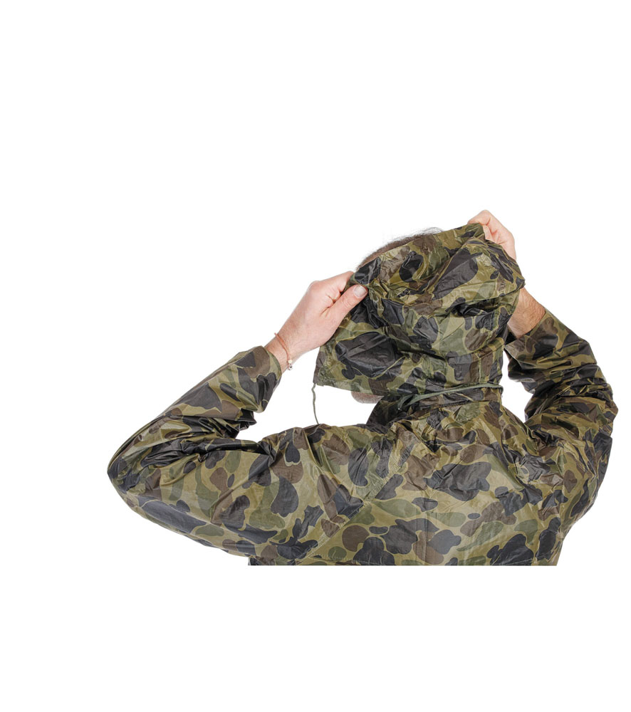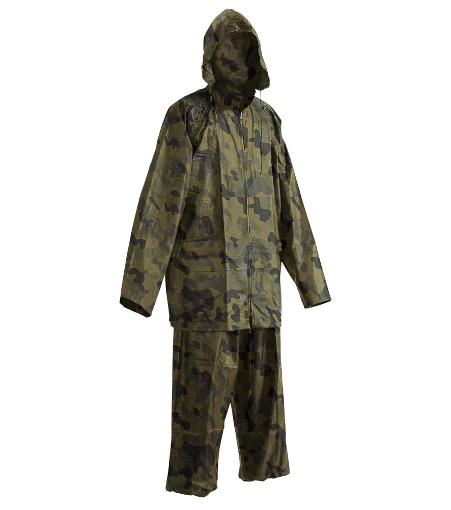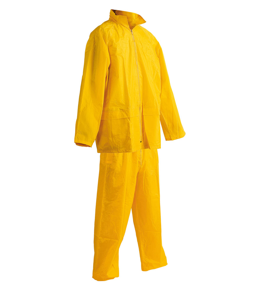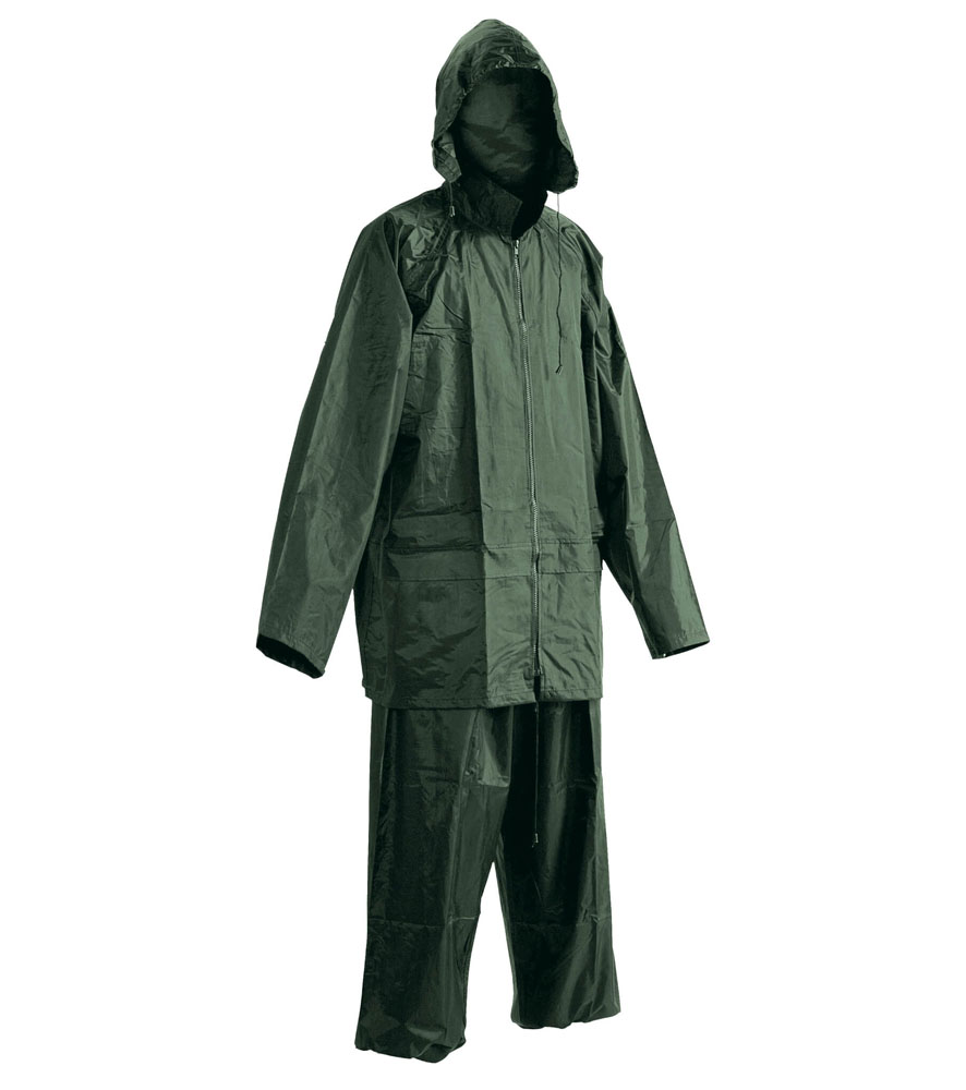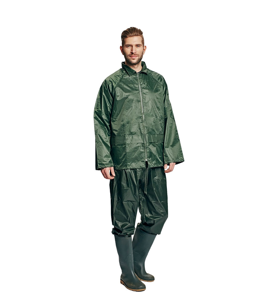 Kétrészes vízálló öltöny kapucnival. ¾-es esőkabát gallérba hajtott kapucnival és rugalmas derekú nadrággal. 2 széles mellső zseb hajtókával védve a víz bejutásától. Tároló táska.