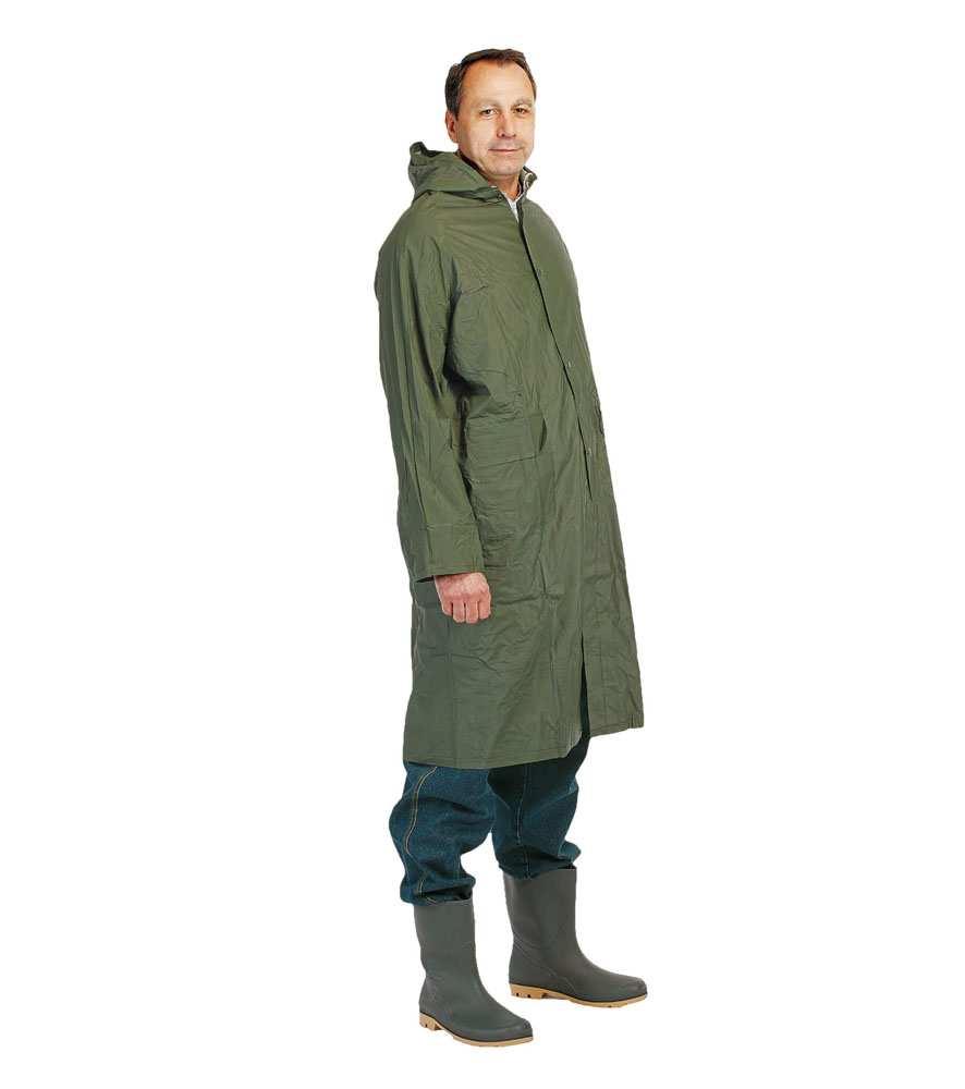 Vízálló esőkabát kapucnival. Bővített hossz. PVC bevonatú anyag. Mellső zsebek hajtókával védve a víz bejutásától.