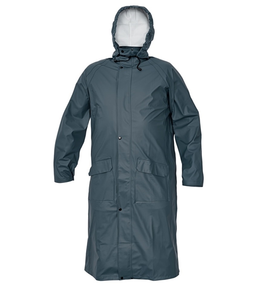 Vízálló és szélálló bő szabású esőkabát, gallérba hajtott kapucnival. Kettő széles mellső zseb hajtókával védve a víz bejutásától az ujján patenttal állítható.