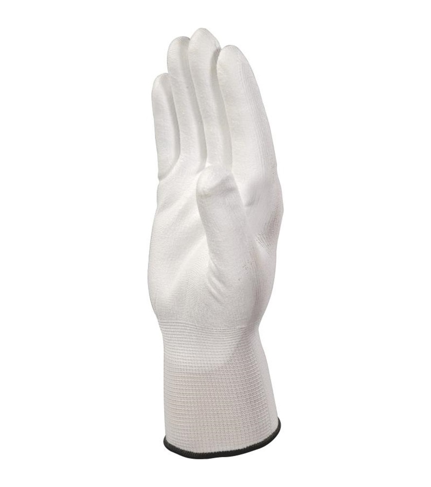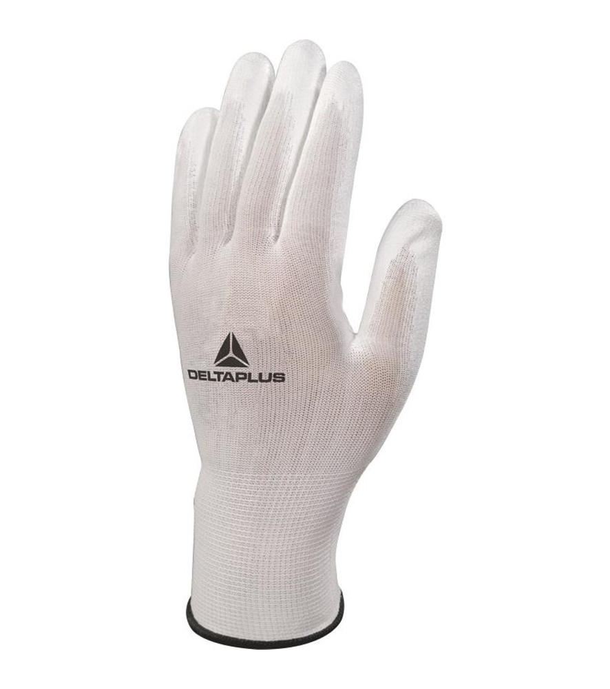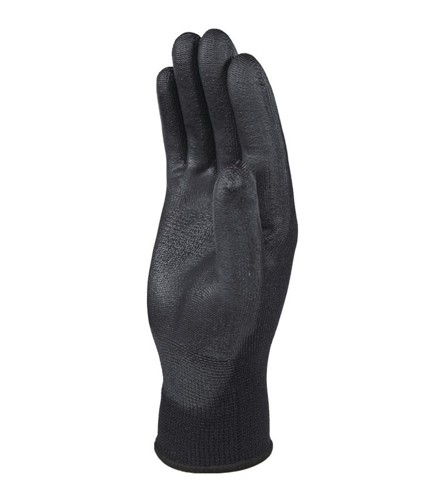 100% poliészter. Poliuretán mártottság a tenyéren és az ujjbegyeken. 13-as szemszám.