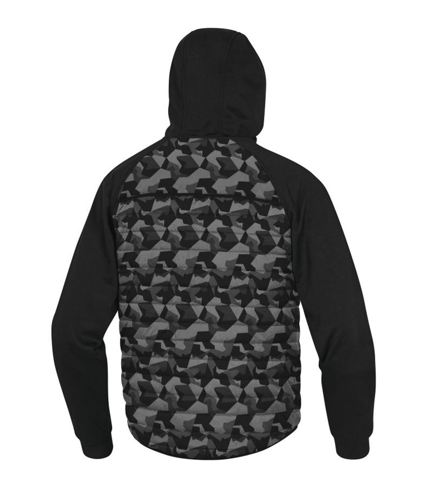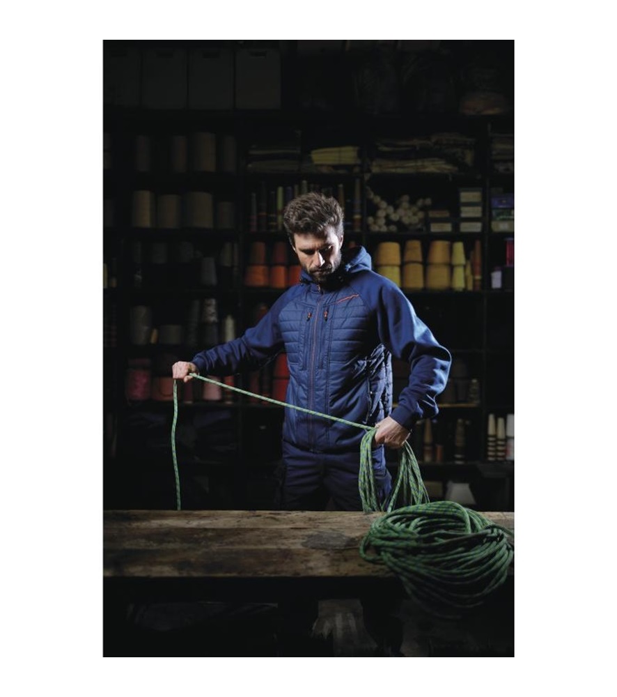 Kétanyagú kabát. Hideg elleni cipzárral záródó. Bordázott csuklórész. 5 zseb. Fix kapucni.